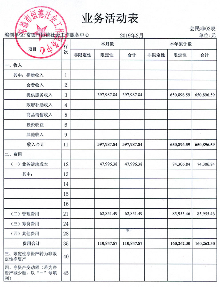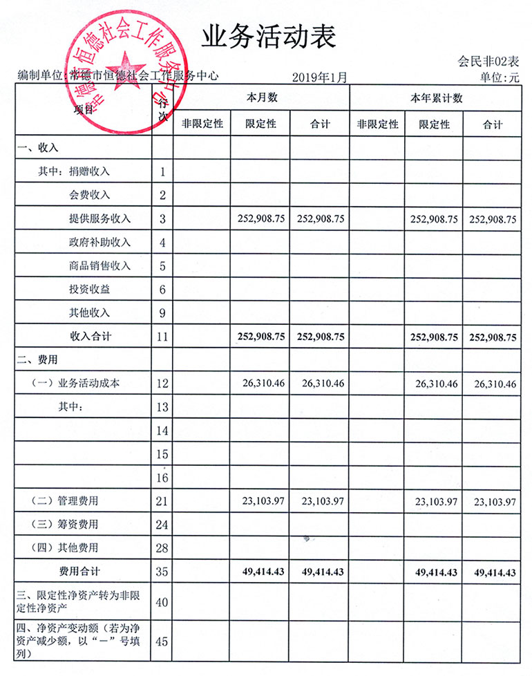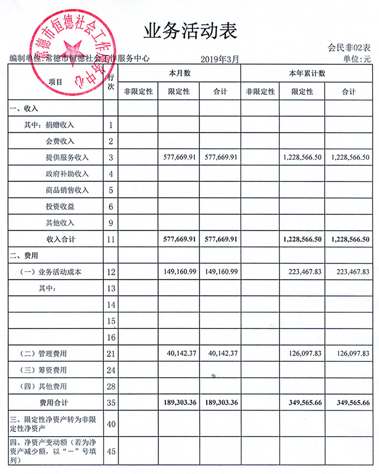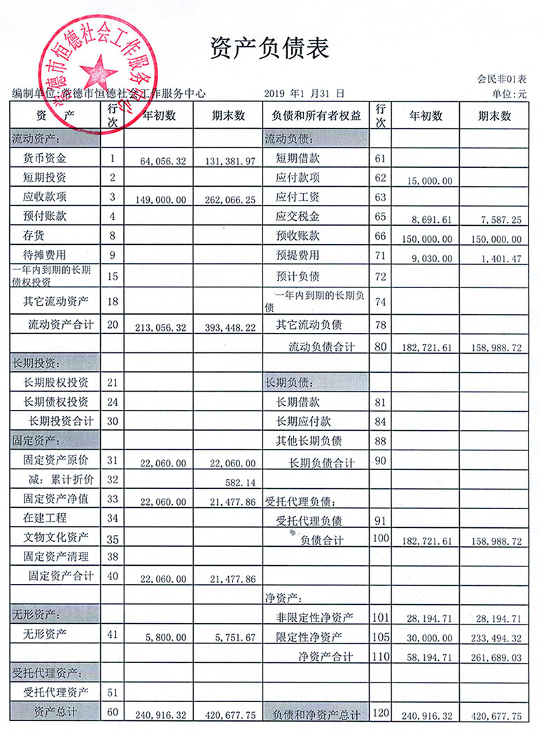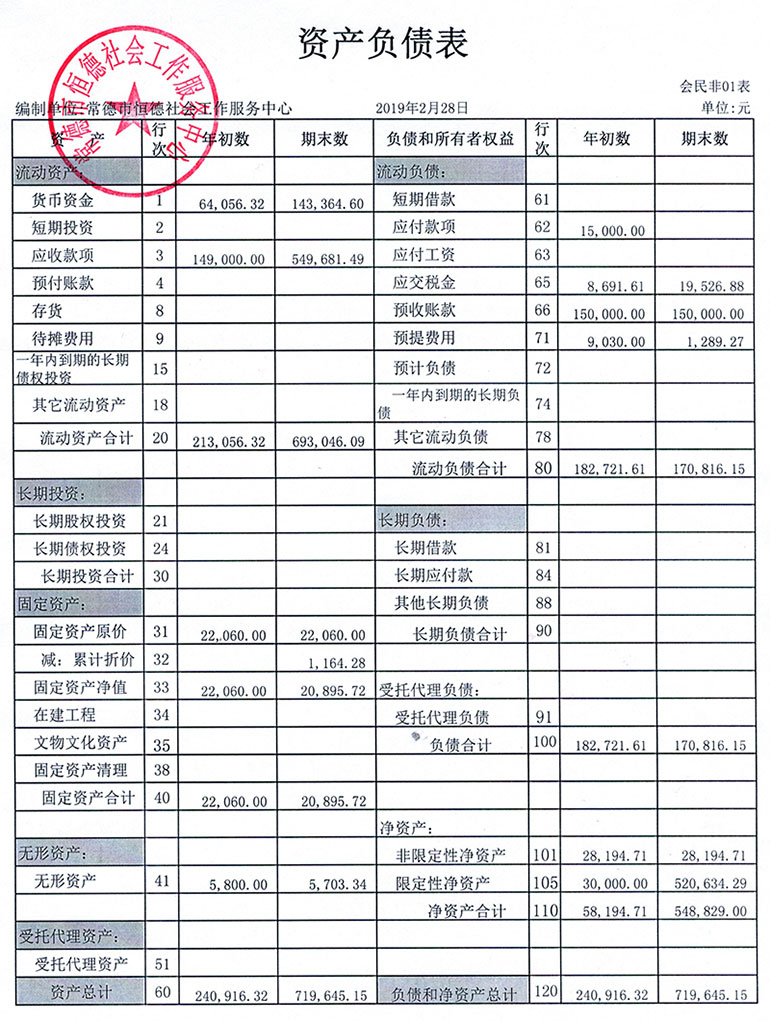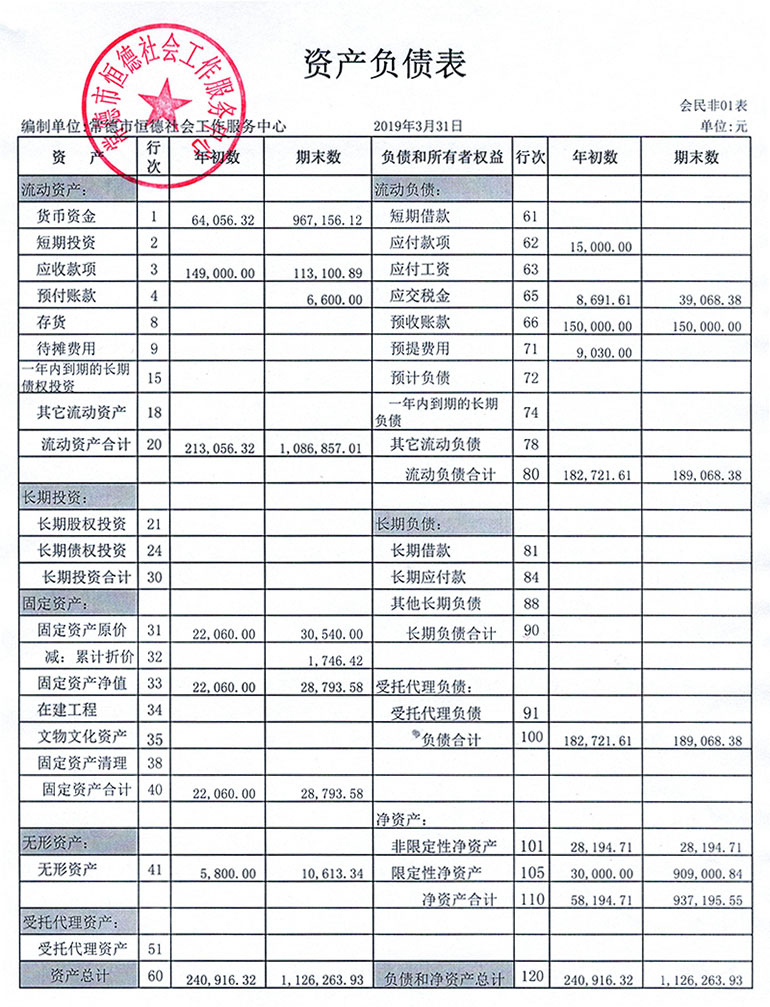 从2015年成立至今,常德市恒德社会工作服务中心已经走过了4个年头,我们严格执行《民办非企业单位财务制度》,按照民间非营利组织财务制度的规定,对外提供真实、完整的财务报告。现将常德恒德社工2019年第1季度财务报表进行公示。