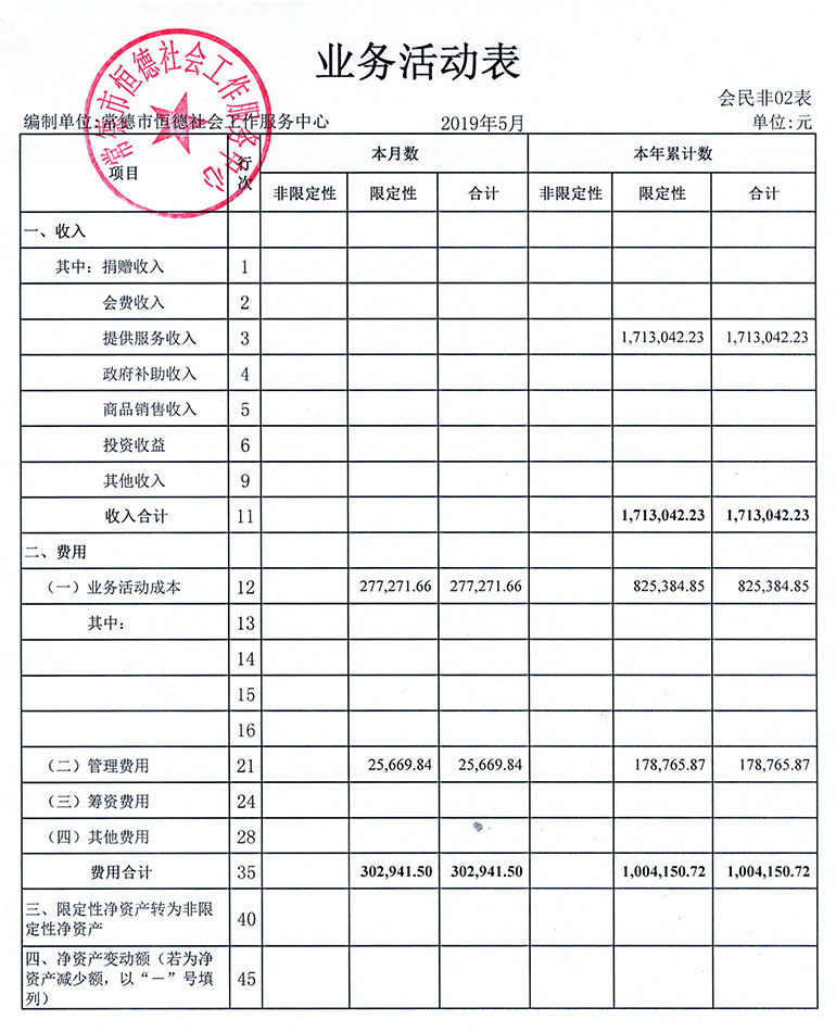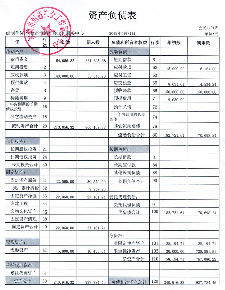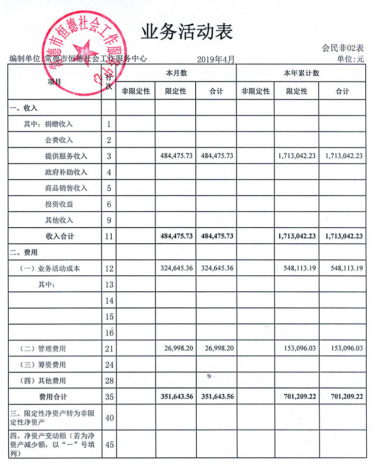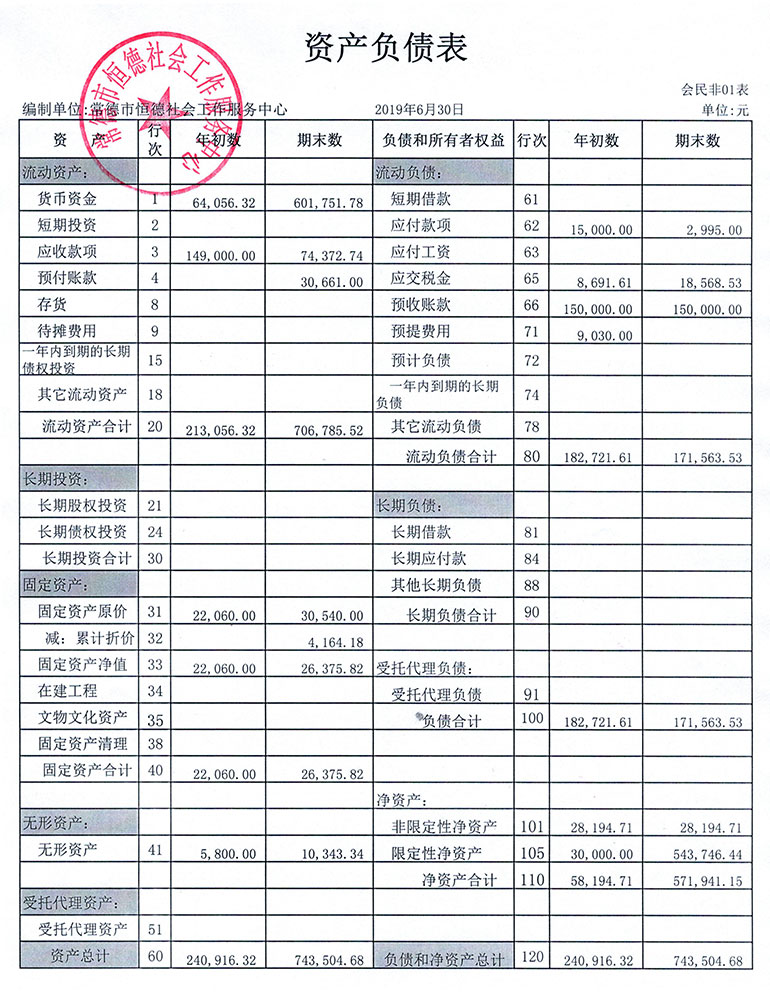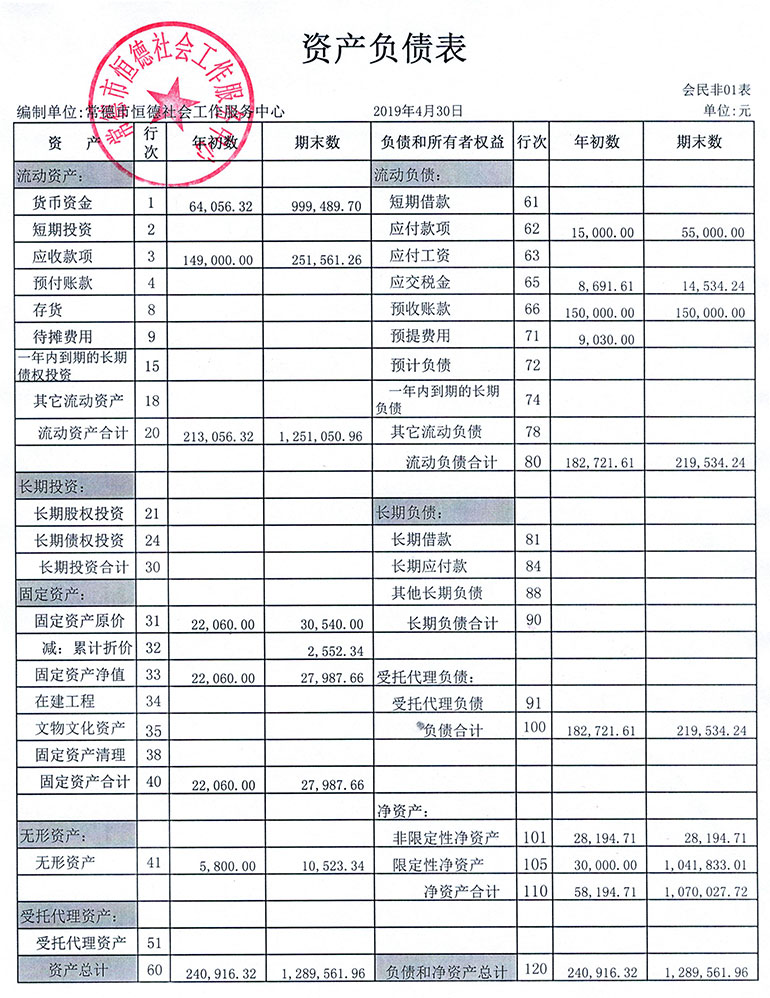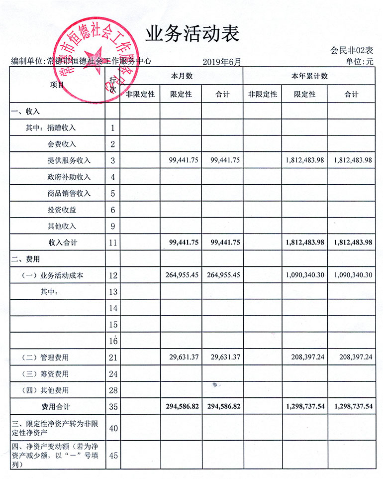 从2015年成立至今,常德市恒德社会工作服务中心已经走过了4个年头,我们严格执行《民办非企业单位财务制度》,按照民间非营利组织财务制度的规定,对外提供真实、完整的财务报告。现将常德恒德社工2019年第2季度财务报表进行公示。
