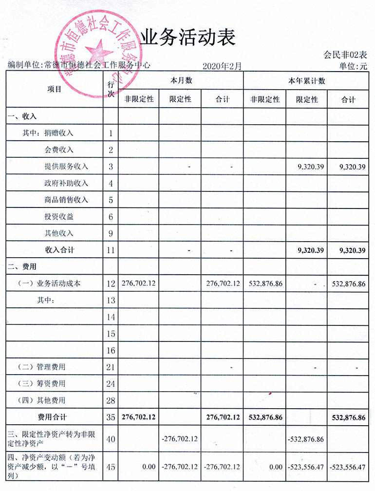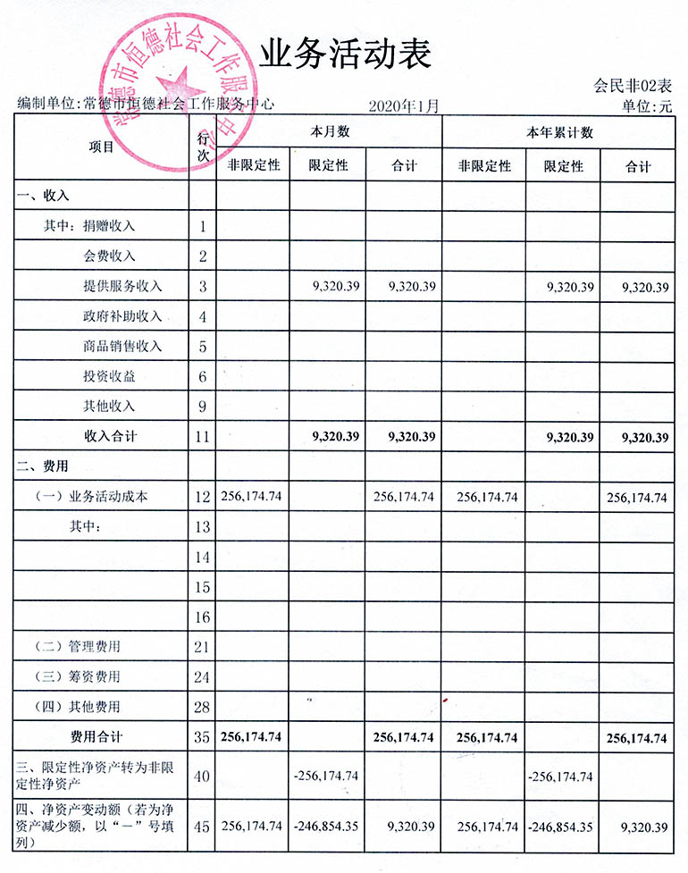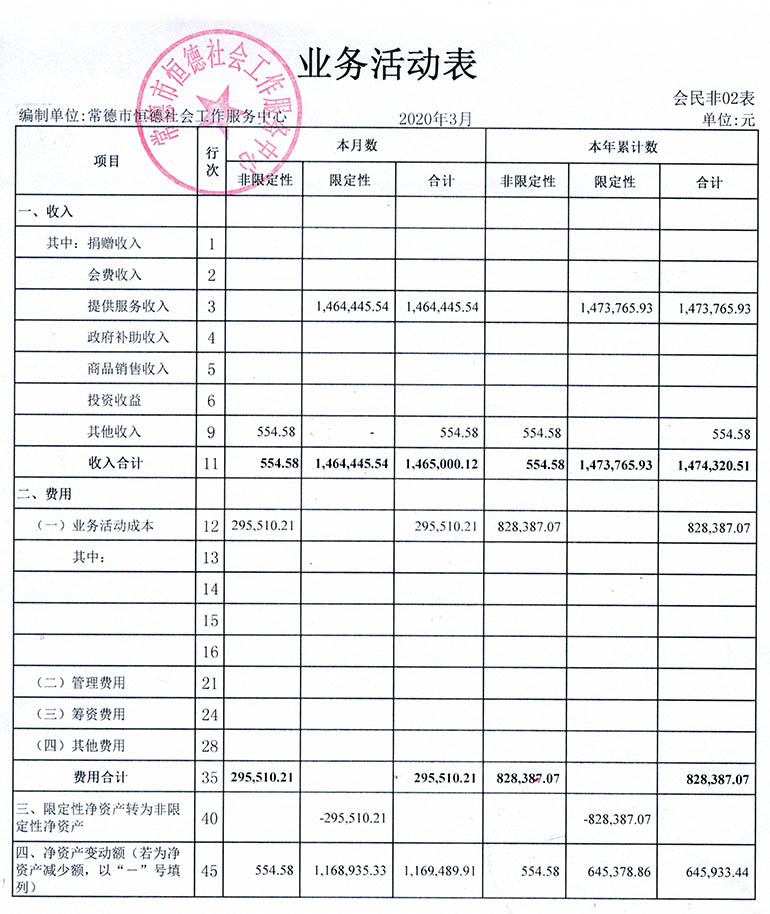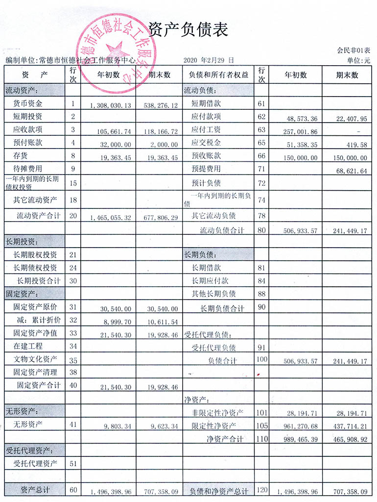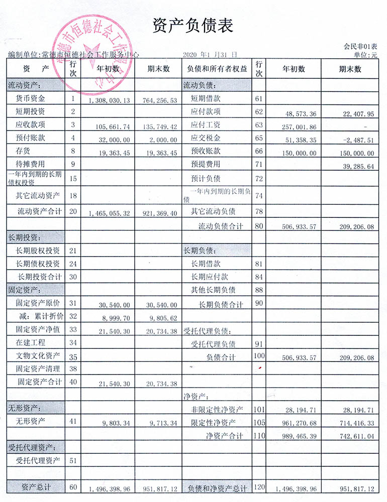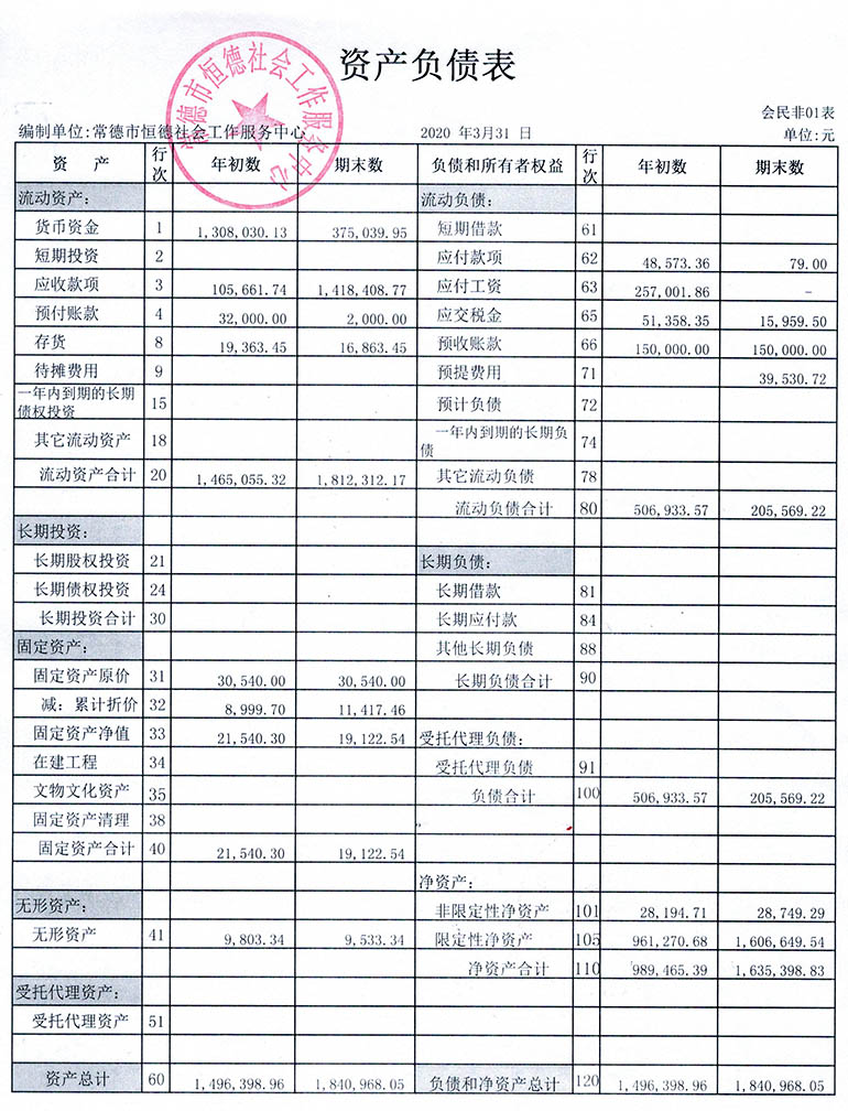 从2015年成立至今,常德市恒德社会工作服务中心已经走过了5个年头,我们严格执行《民办非企业单位财务制度》,按照民间非营利组织财务制度的规定,对外提供真实、完整的财务报告。现将常德市恒德社会工作服务中心2020年第1季度财务报表进行公示。