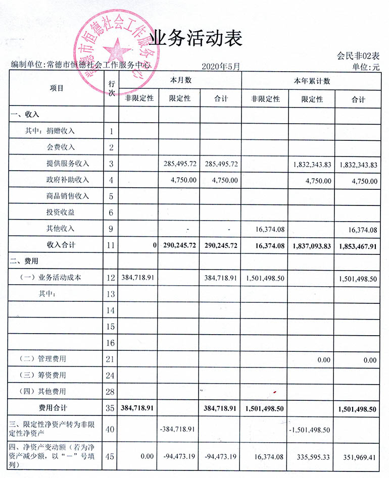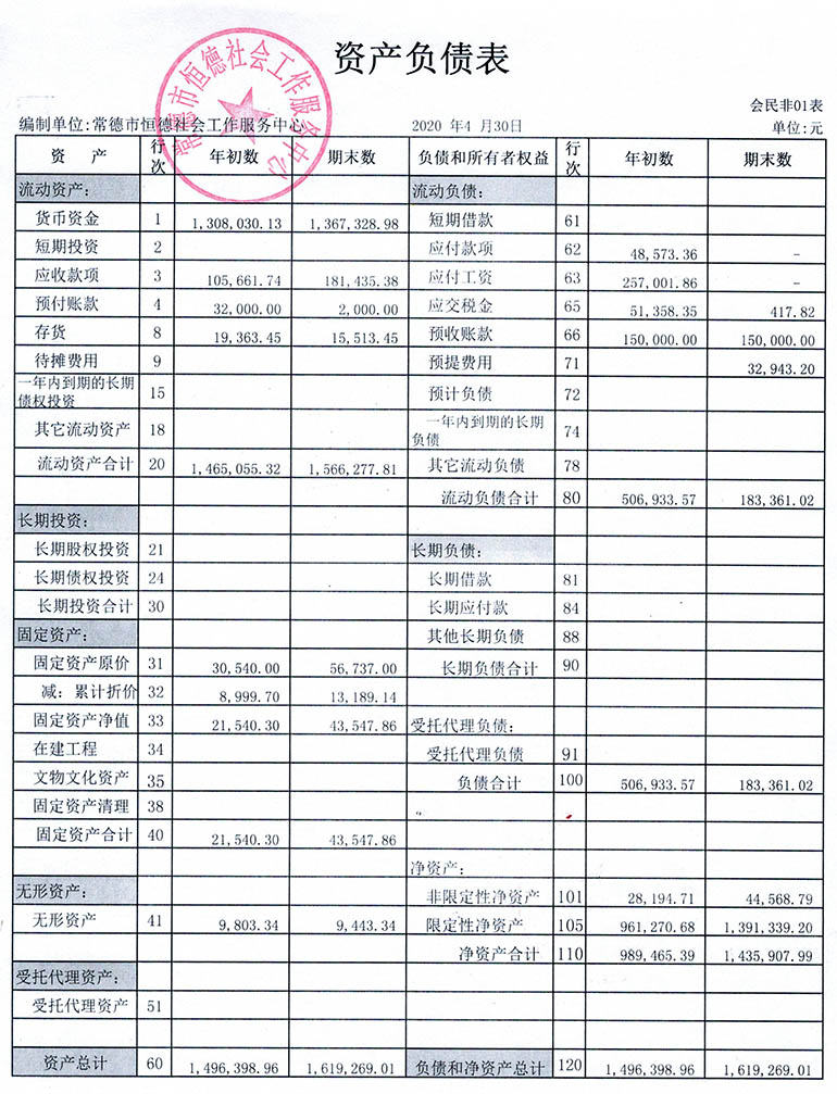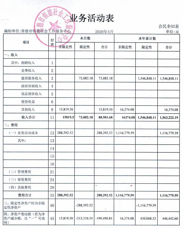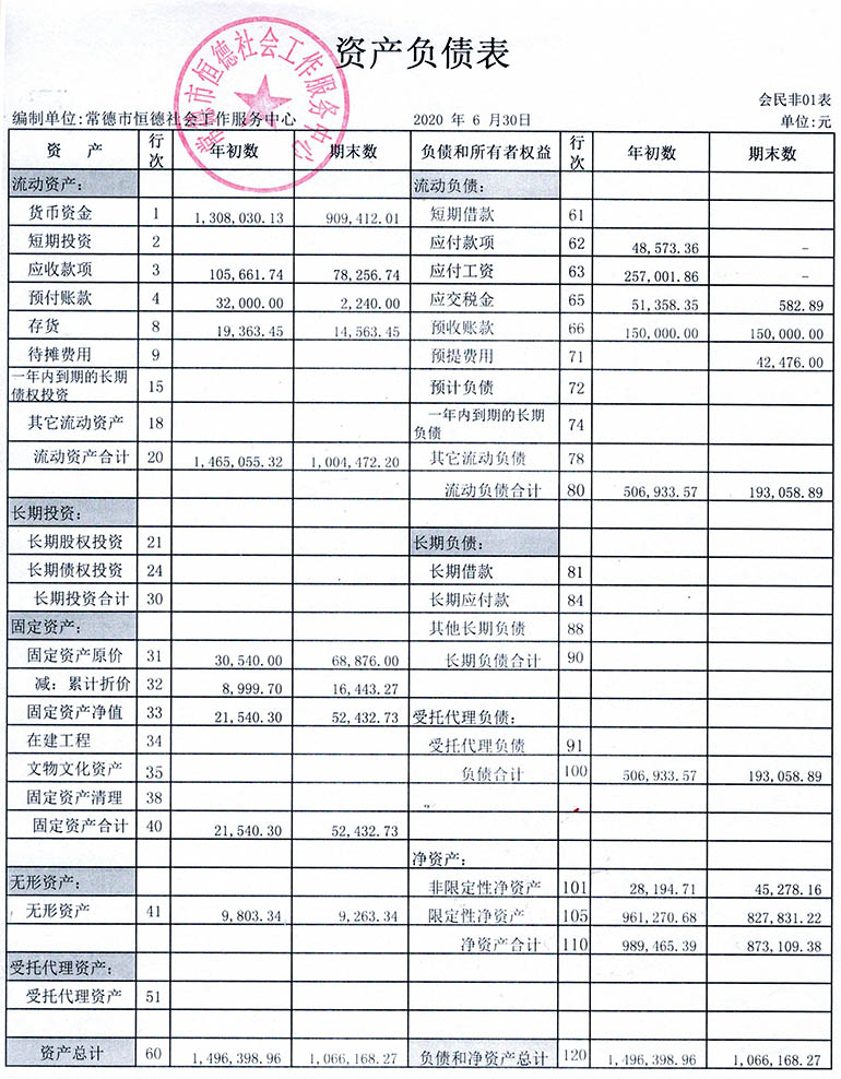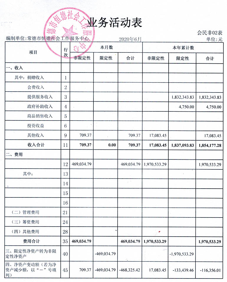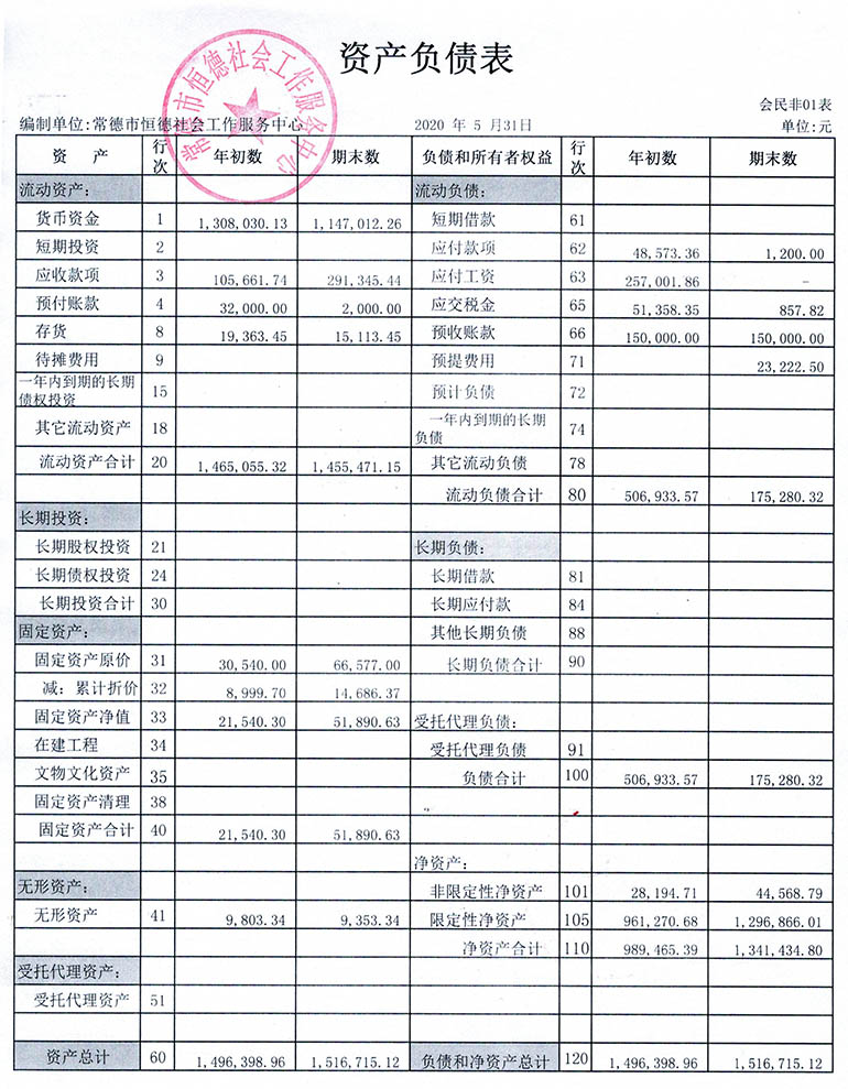 从2015年成立至今,常德市恒德社会工作服务中心已经走过了5个年头,我们严格执行《民办非企业单位财务制度》,按照民间非营利组织财务制度的规定,对外提供真实、完整的财务报告。现将常德市恒德社会工作服务中心2020年第2季度财务报表进行公示。