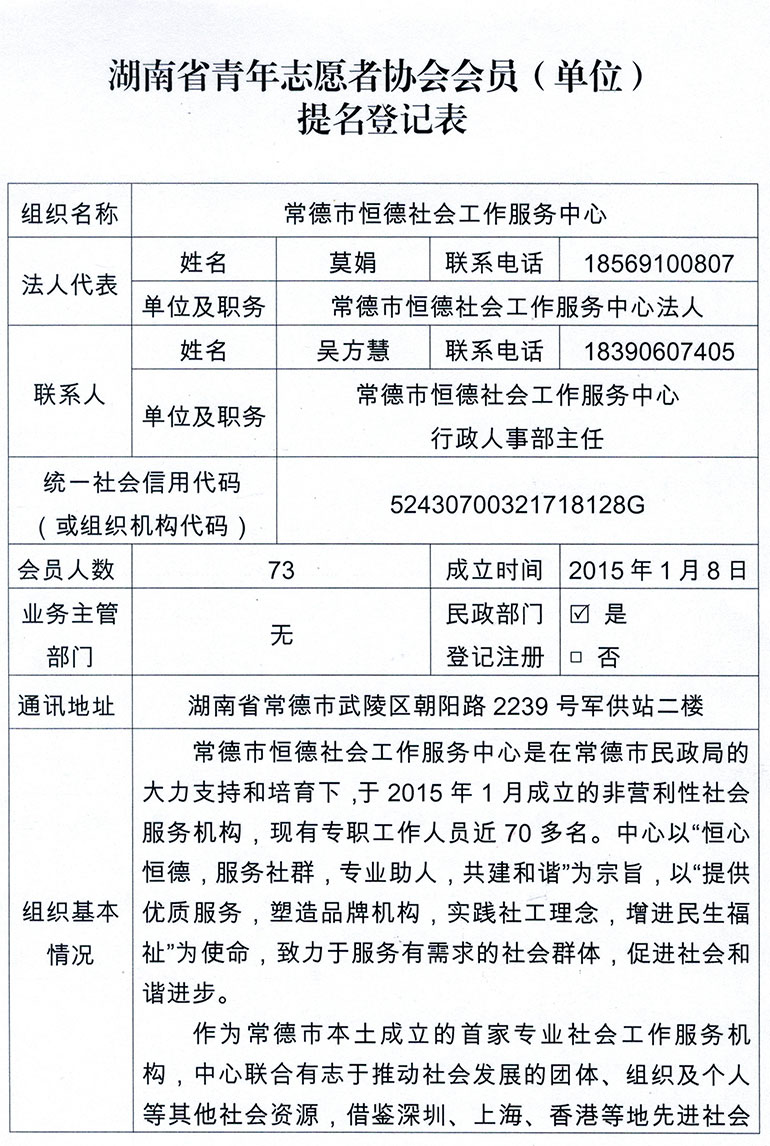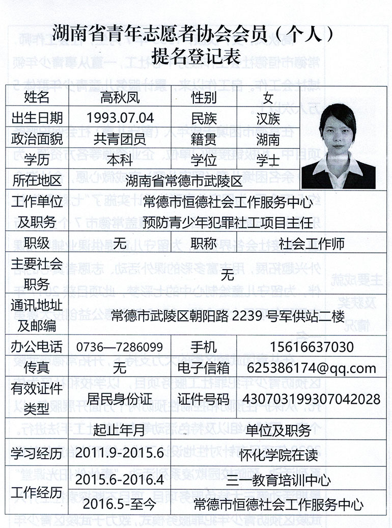 根据《关于推荐湖南省青年志愿者协会第三届会员、理事会理事候选人的通知》的要求,我机构申请自愿加入成为单位会员,同时经过大家同意及机构审核,我机构同工高秋凤自愿申请加入成为个人会员,现将填报的相关提名登记表公示如下: