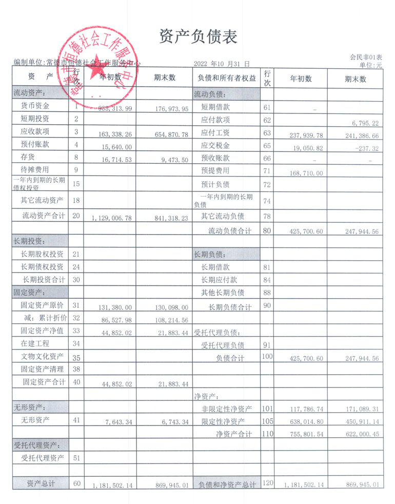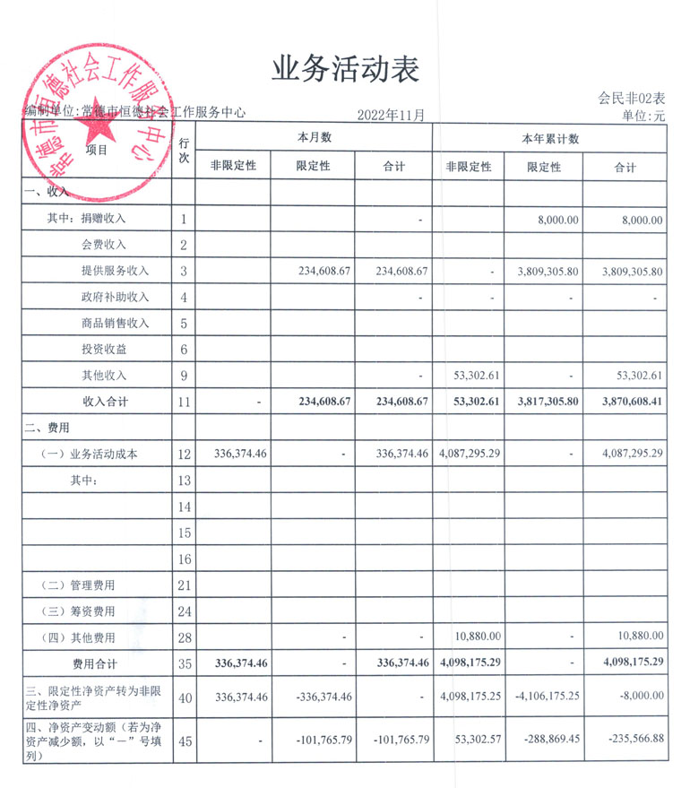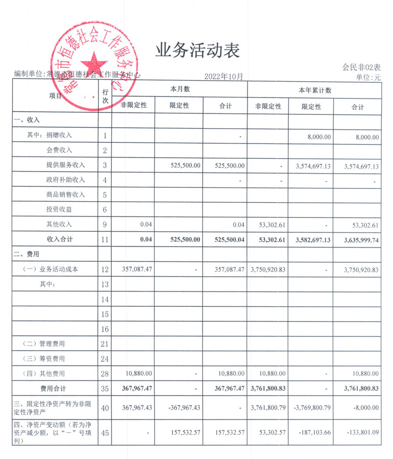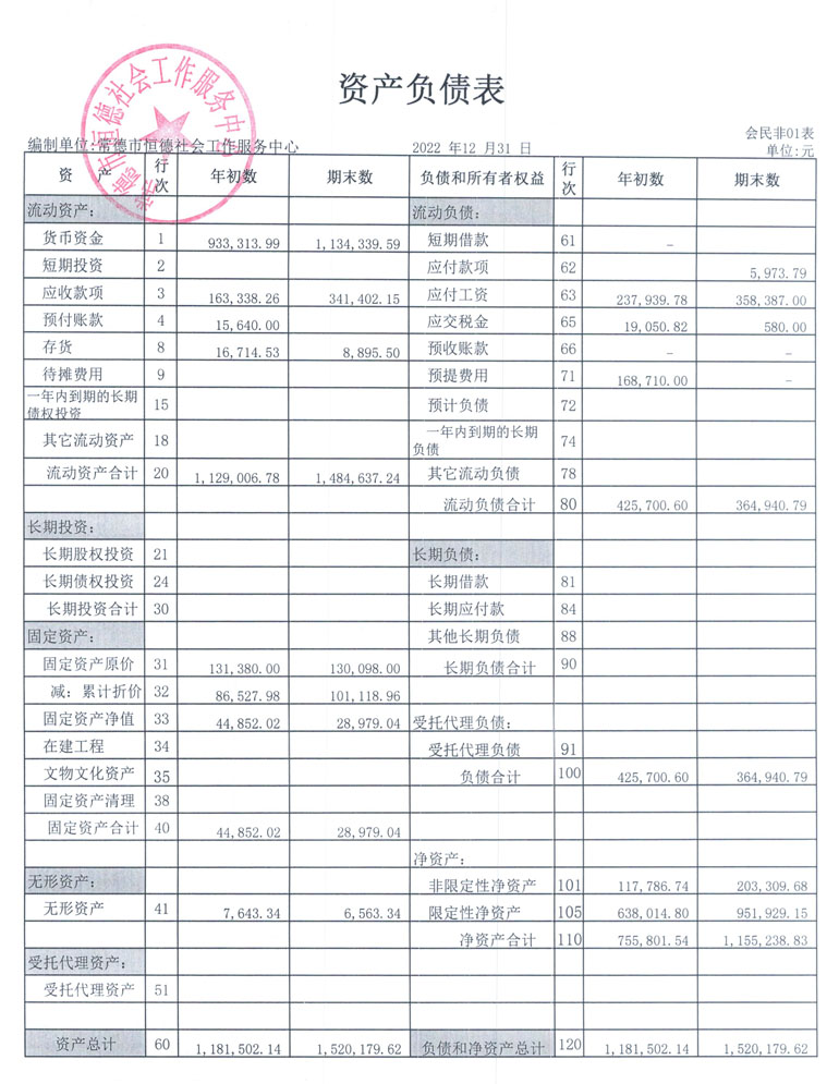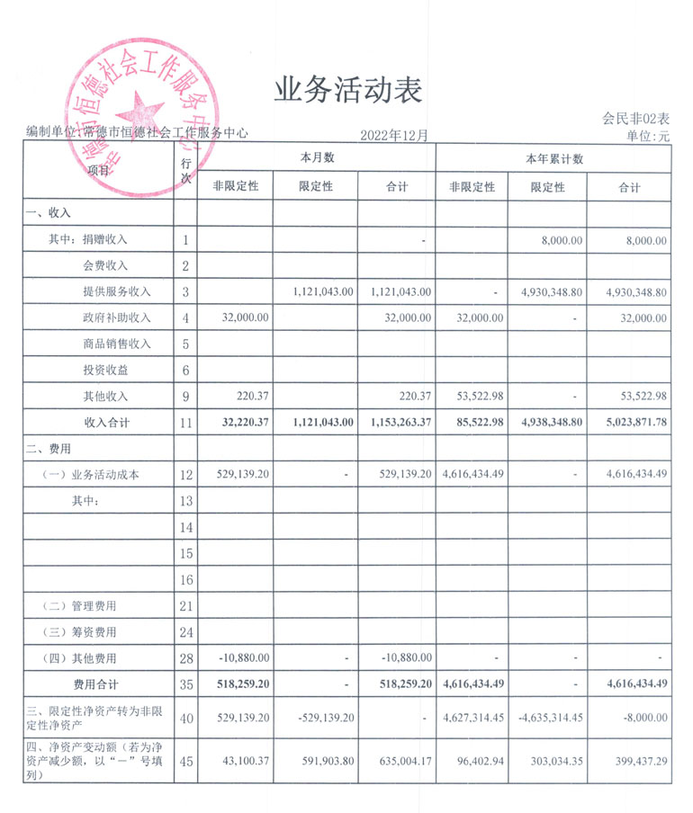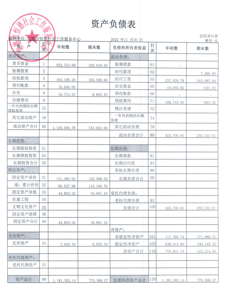 从2015年成立至今,常德市恒德社会工作服务中心已经走过了7个年头,我们严格执行《民办非企业单位财务制度》,按照民间非营利组织财务制度的规定,对外提供真实、完整的财务报告。现将常德恒德社工2022年第4季度财务报表进行公示。