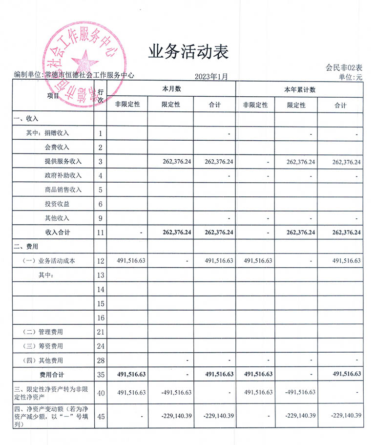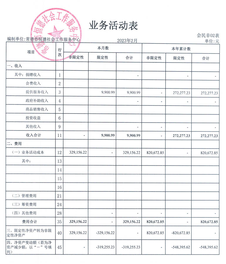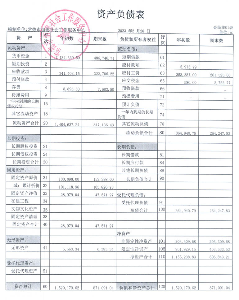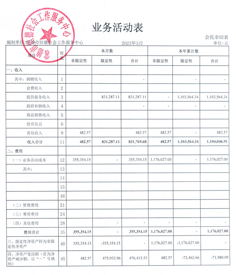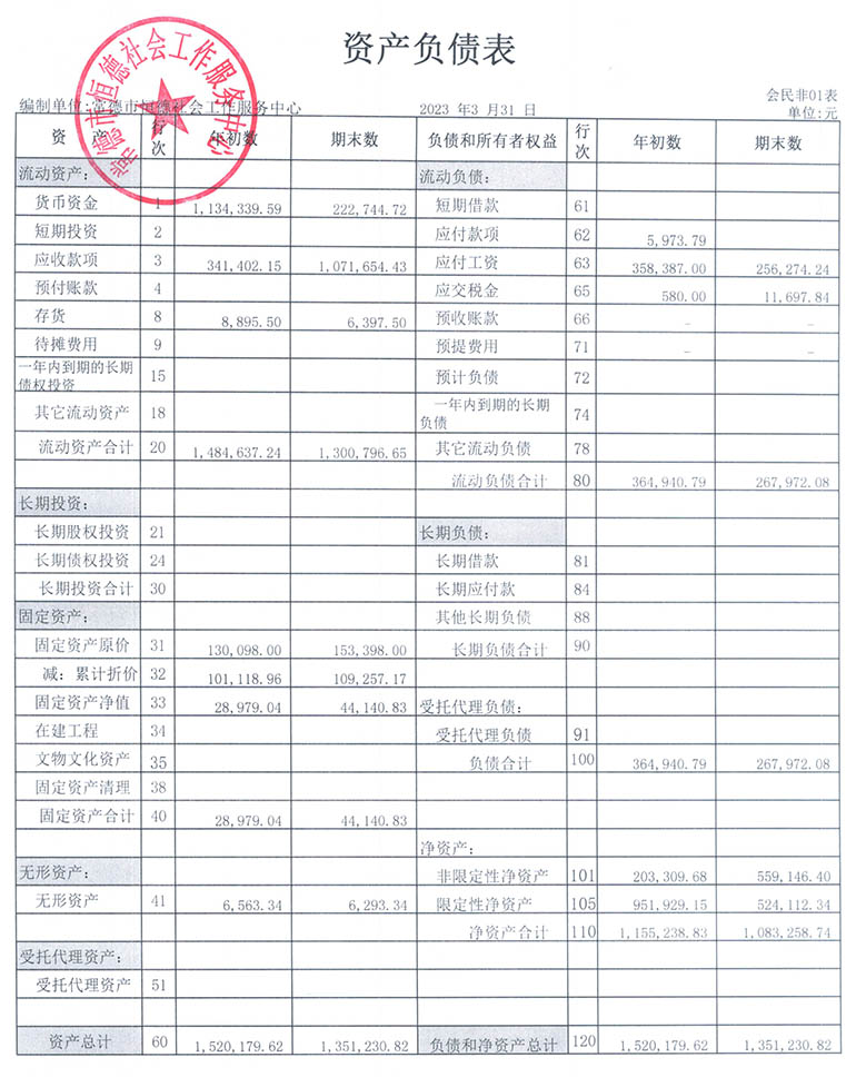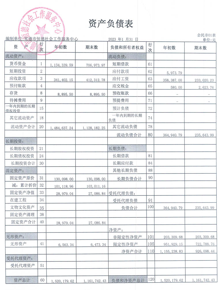 从2015年成立至今,常德市恒德社会工作服务中心已经走过了8个年头,我们严格执行《民办非企业单位财务制度》,按照民间非营利组织财务制度的规定,对外提供真实、完整的财务报告。现将常德恒德社工2023年第1季度财务报表进行公示。