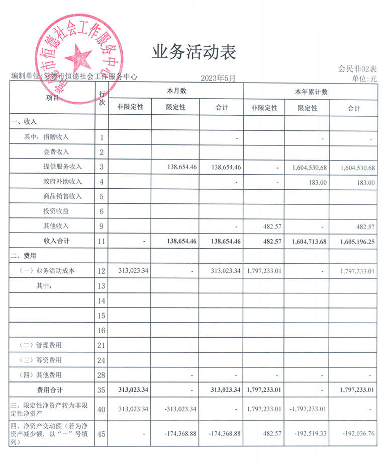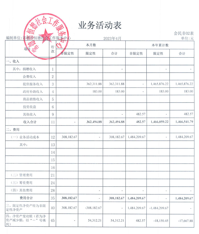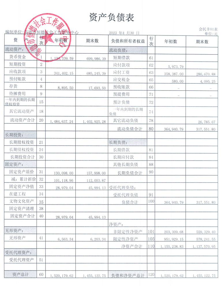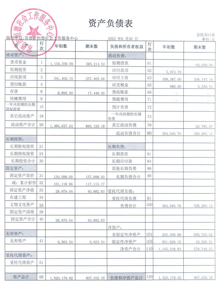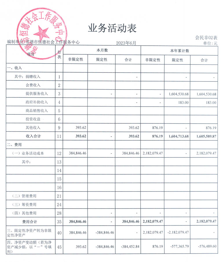 从2015年成立至今,常德市恒德社会工作服务中心已经走过了8个年头,我们严格执行《民办非企业单位财务制度》,按照民间非营利组织财务制度的规定,对外提供真实、完整的财务报告。现将常德恒德社工2023年第2季度财务报表进行公示。