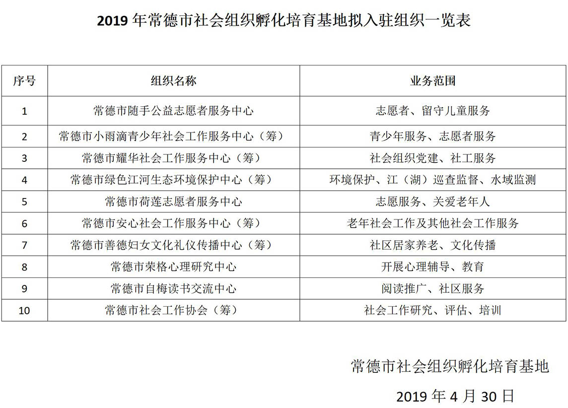 根据湖南省民政厅关于印发《社会组织孵化基地建设管理实施方案》通知的要求,现将我机构承接的常德市社会组织孵化培育基地项目2019年拟入驻基地的社会组织名单进行公示,公示期为7个工个日,如对