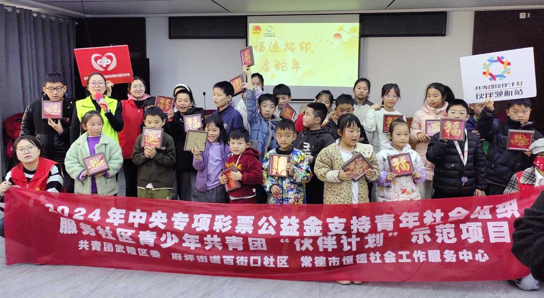 2024年12月15日,在中央专项彩票公益金、共青团武陵区委、武陵区府坪街道百街口社区的大力支持下,常德市恒德社会工作服务中心联合湖南幼专学前教育学院团总支爱幼队走进百街口社区,举办了一场别开生面的“福运拓印启蛇年”主题活动。